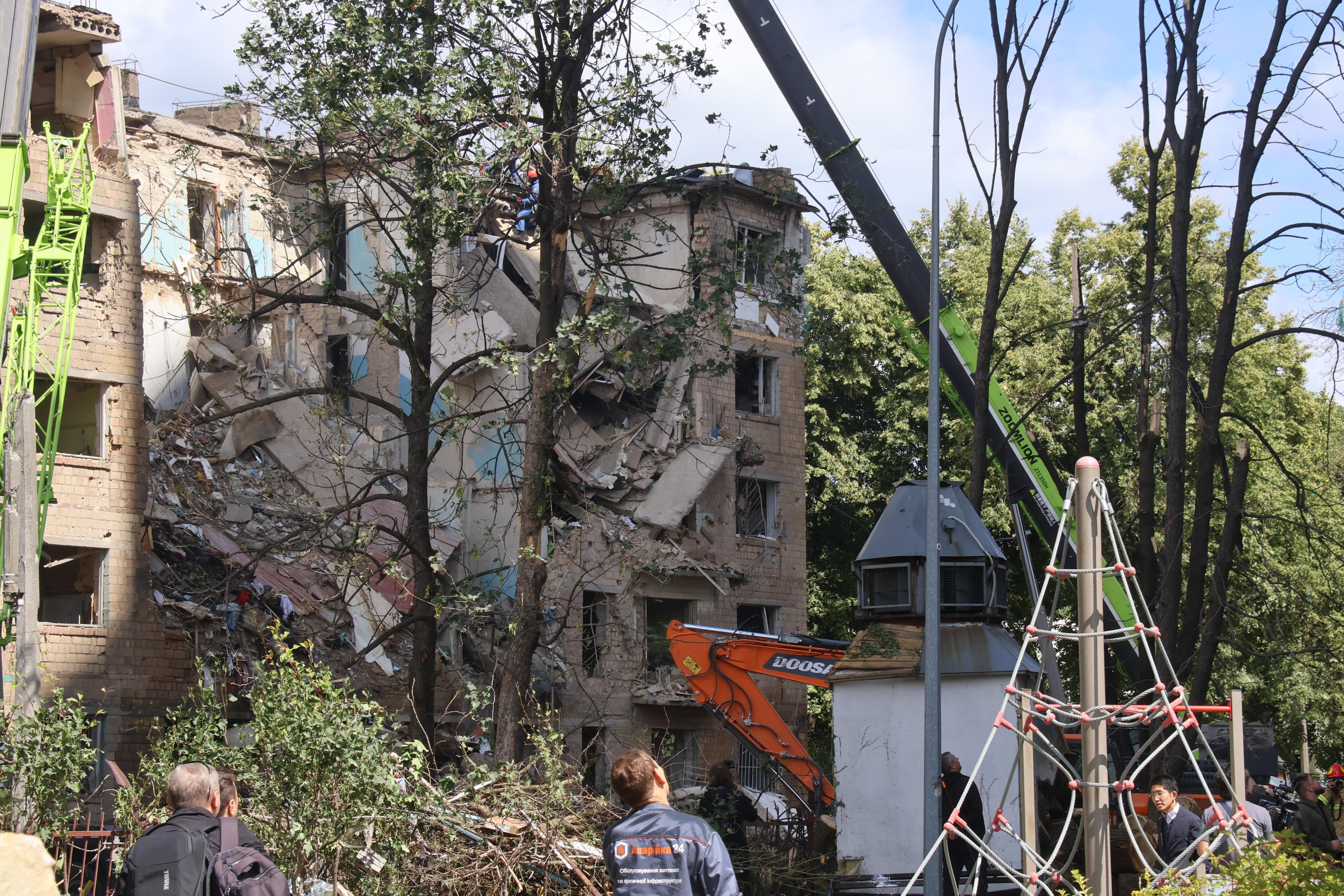 6月23日,乌克兰国家紧急情况局工作人员在基辅市的舍甫琴科夫斯基区遭空袭现场进行搜寻和清理工作。新华社发(彼得·德鲁克摄)